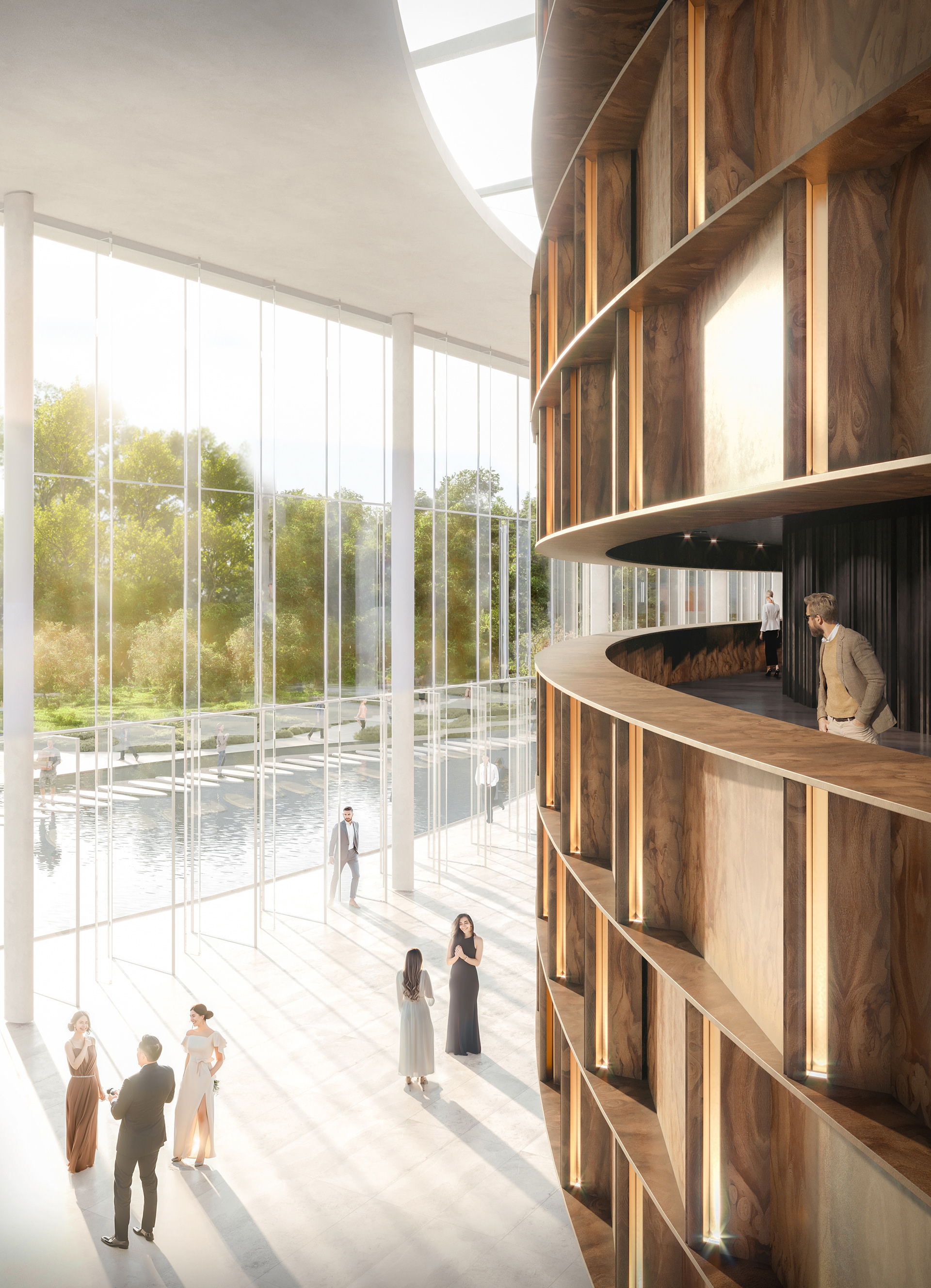 - Zoning of experiences: the building and its surroundings were designed so, to constitute a sequence of differentiated concentric landscaping and architectural interiors (the zones of nature described below, activity, concentration and art).